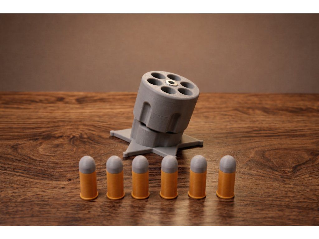 Tento bubínek ji vytváří. Otočíte ho po směru hodinových ručiček, mechanismus uvnitř cvakne a náboj fyzicky vyskočí z bubínku. Šest nábojů, šest životů – každý ztracený má svůj zvuk i svůj moment.